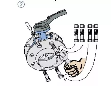 1、如所示,將閥門放置于預(yù)安裝的兩片法蘭之間,注意螺栓孔要整齊對(duì)齊。