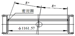 閥體起密封作為的為密封圈,焊接在閥體內(nèi)(圖5)。在2.5m立車上將組焊好的閥體裝夾在閥體密封圈加工工裝上,將立車刀桿旋轉(zhuǎn)8°,根據(jù)圖紙設計要求,找正后沿圓錐母線方向走刀,車至未焊不銹鋼前的尺寸。然后堆焊不銹鋼,最后將焊好不銹鋼的閥體重新上立車,按上述方法車閥體密封圈至圖紙要求尺寸。最后在立車刀架上裝磨頭,對閥體密封圈進行磨削處理,使其達到圖紙設計粗糙度要求。